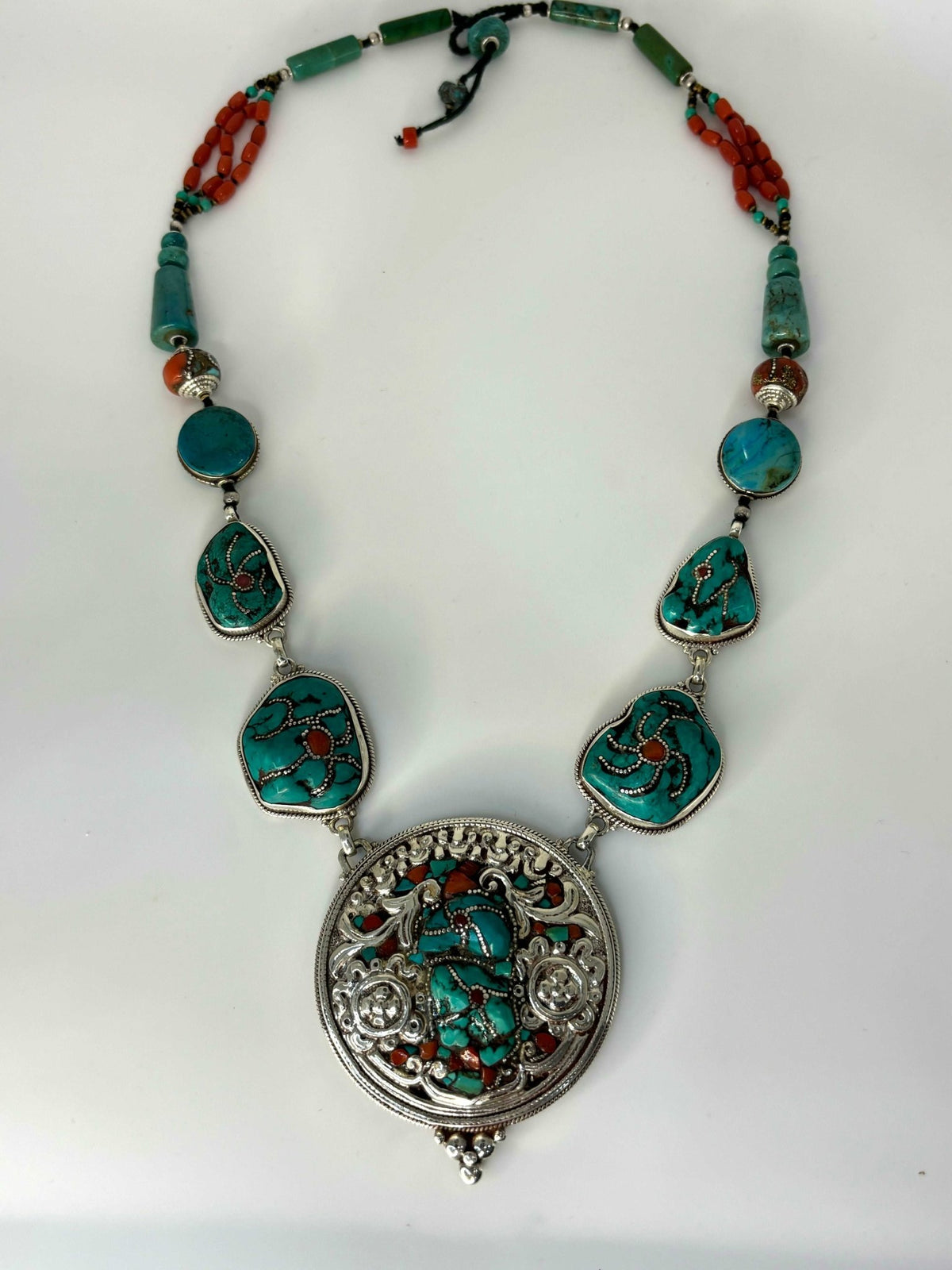 Questa collana unica è realizzata con un medaglione interamente in argento 925 decorato con corallo e turchese. Il medaglione è reversibile, con un lato in corallo e l'altro in turchese, offrendo una versatilità unica. Una gioia per gli amanti dei gioielli in argento e dei colori della natura.