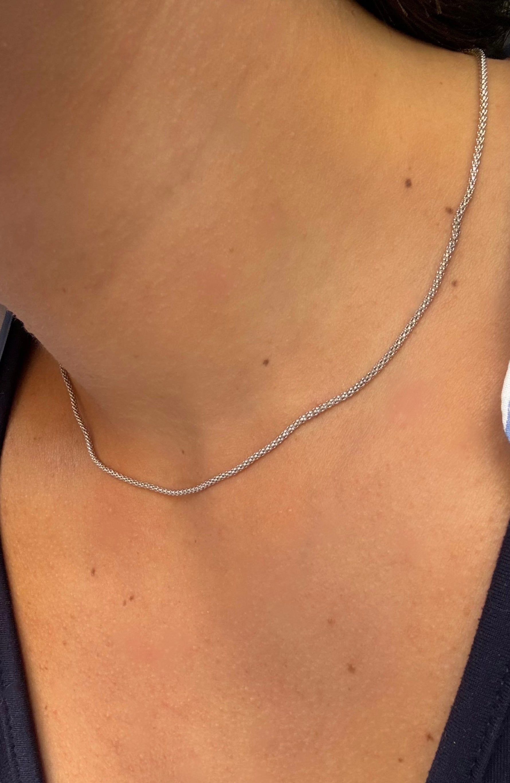Catenina realizzata in Argento Sterling 925 con finitura lucida, caratterizzata dalla tipica maglia pop corn, nota per la sua struttura tubolare formata da piccoli anelli sferici intrecciati. Questo tipo di lavorazione conferisce alla collana un aspetto elegante e brillante, pur mantenendo leggerezza e flessibilità.