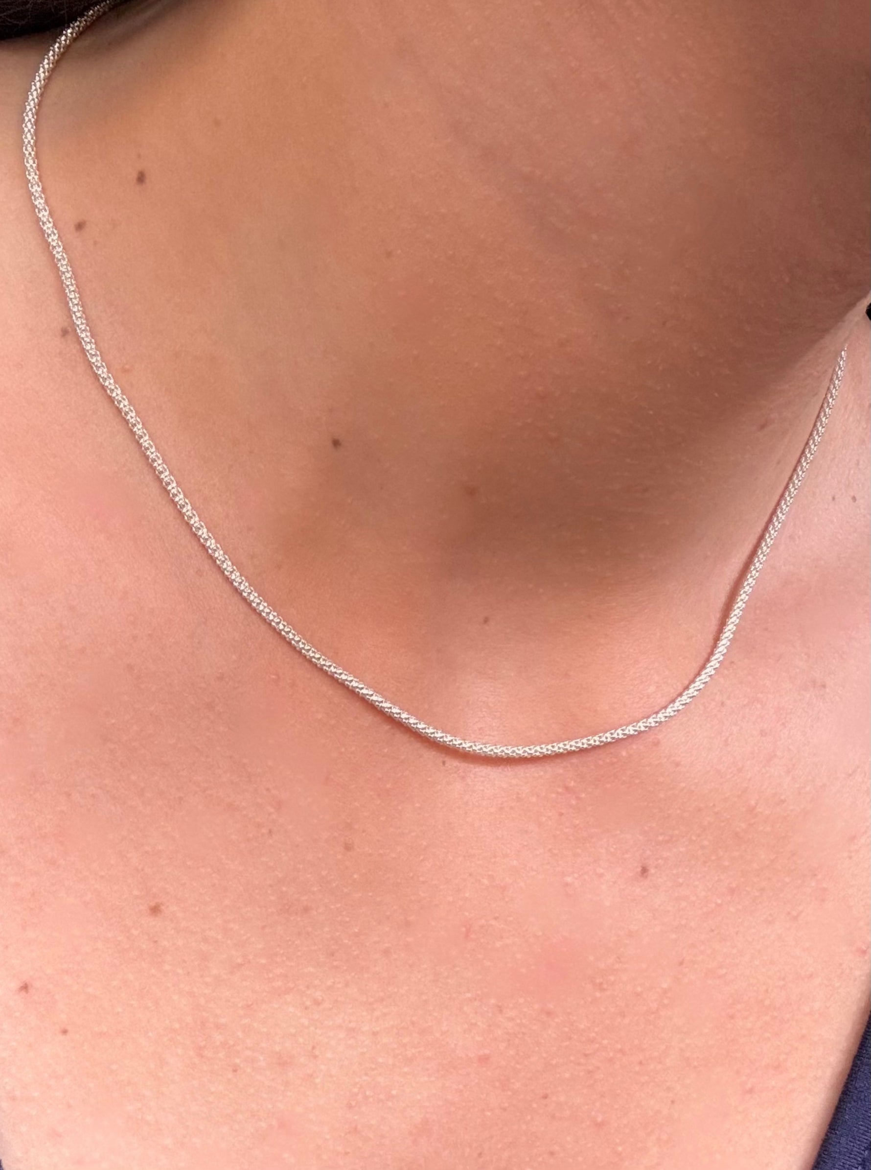 Catenina realizzata in Argento Sterling 925 con finitura lucida, caratterizzata dalla tipica maglia pop corn, nota per la sua struttura tubolare formata da piccoli anelli sferici intrecciati. Questo tipo di lavorazione conferisce alla collana un aspetto elegante e brillante, pur mantenendo leggerezza e flessibilità.