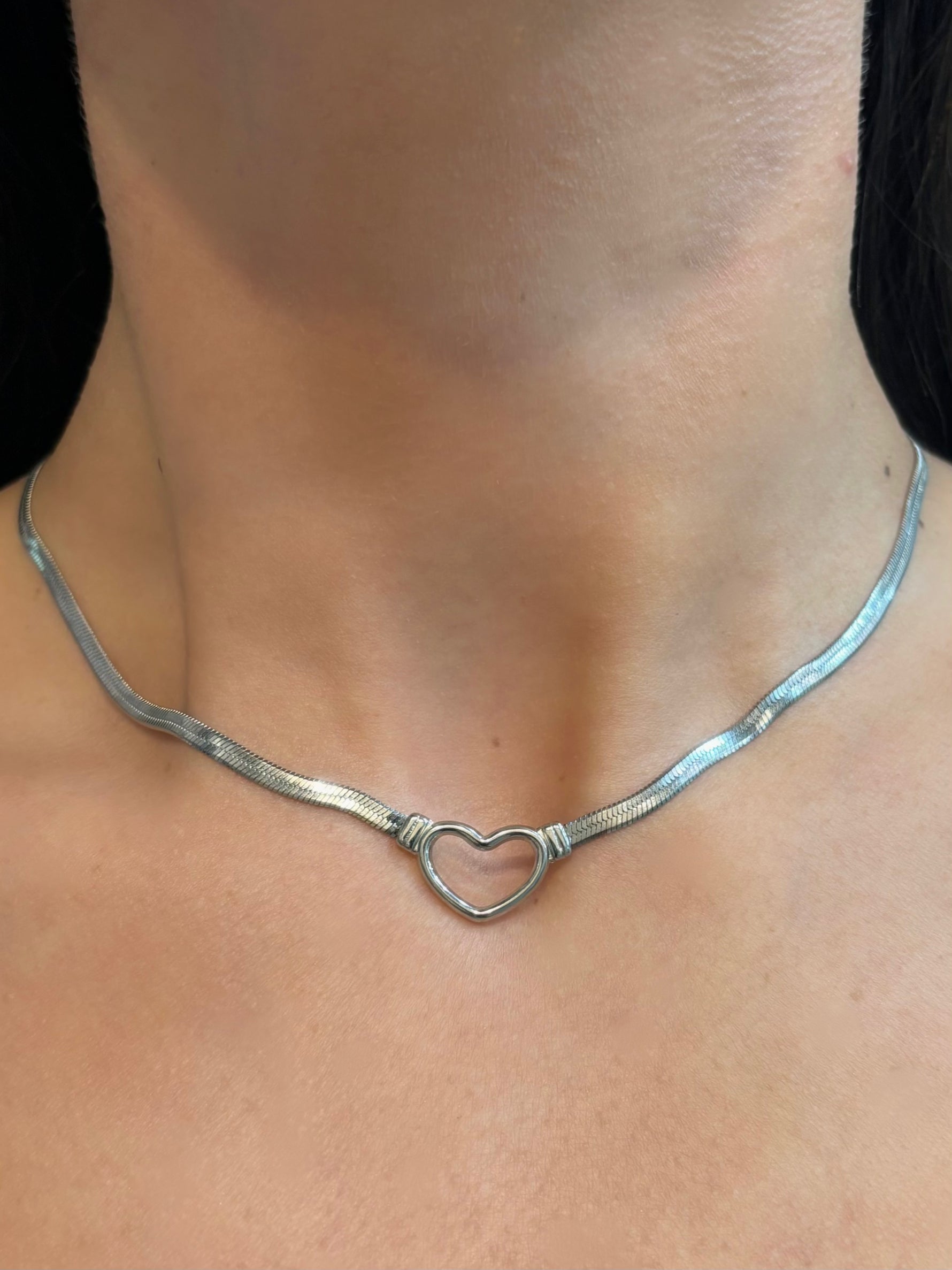 - Design: Catena piatta che si adagia elegantemente sul collo, impreziosita da un cuore centrale vuoto, simbolo di leggerezza e romanticismo.