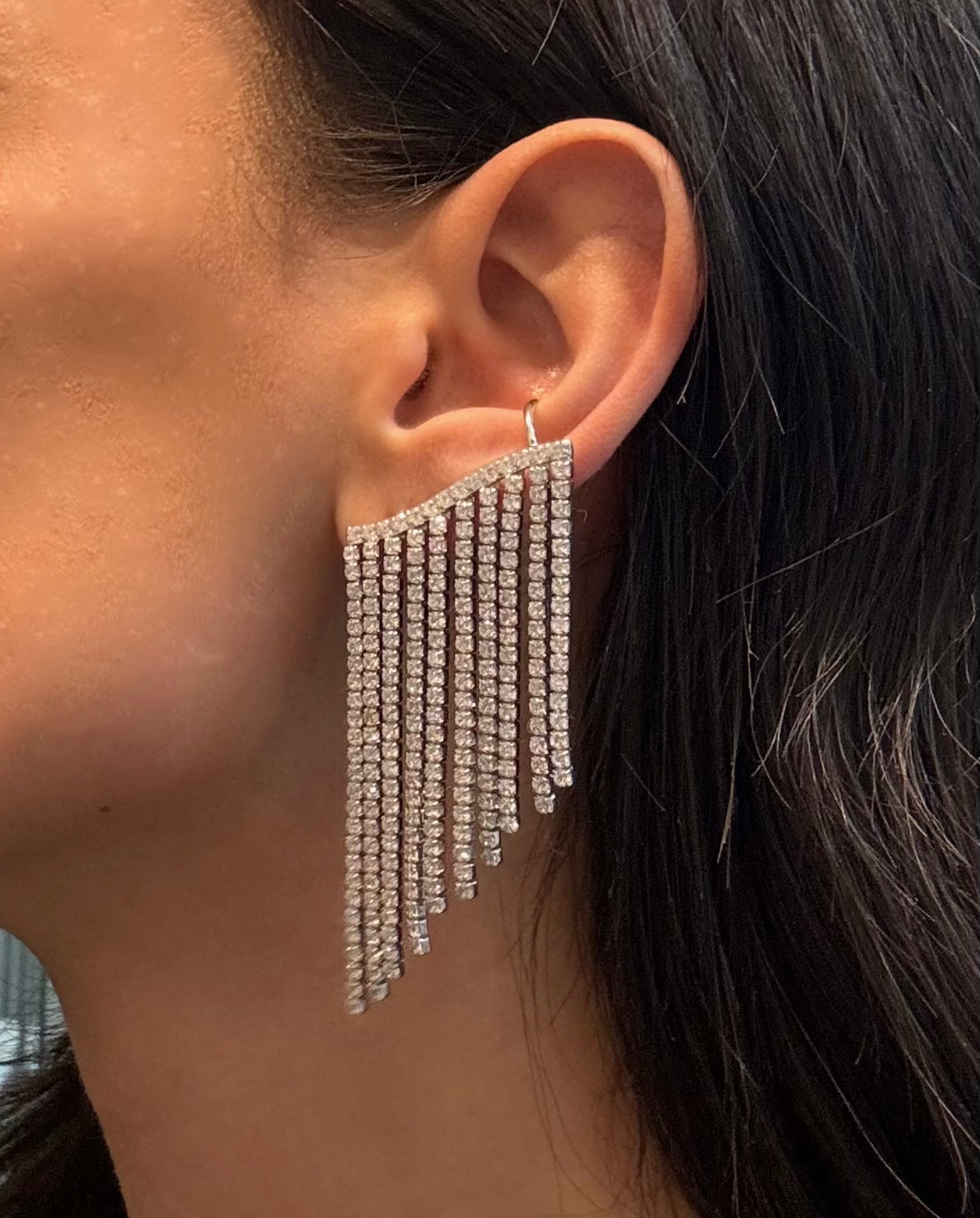 Aggiungi un tocco di eleganza e originalità al tuo look con questo straordinario orecchino mono che si estende su tutto l'orecchio. Realizzato in argento 925, questo accessorio combina un design moderno e raffinato con la luminosità senza tempo degli zirconi. I dettagli pendenti in zirconi aggiungono un movimento elegante, catturando la luce a ogni passo.
